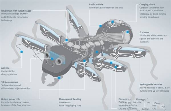 底部有光學傳感器,可以使用地面的紅外線標記進行導航。每個仿生螞蟻機器人體長13.5厘米,重105克。