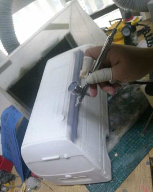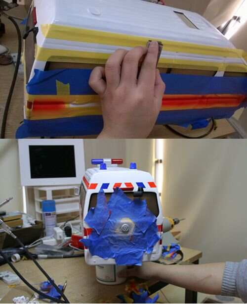 (用不粘膠遮蓋車身,留出車身條紋和logo的位置,進行噴涂)