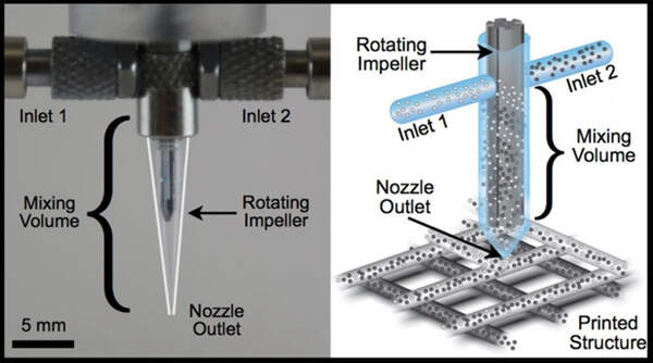 這種打印頭使用的是主動(dòng)混合和快速開(kāi)關(guān)的微型噴嘴,噴嘴內(nèi)部有一個(gè)葉輪,每種流體都由一個(gè)單獨(dú)的入口進(jìn)入混合室,然后由葉輪以恒定的速度旋轉(zhuǎn),使流體在一個(gè)非常窄的間隙中混合,以此來(lái)實(shí)現(xiàn)濃粘彈性油墨的打印,并在3D打印過(guò)程中同時(shí)控制幾何形狀和組成成份。