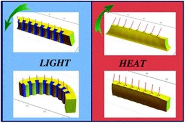 舉例來說,在光線照射下,由這種材料制成的某個樣品會向一個方向彎曲,而受到熱刺激時則會向另一個方向彎曲;另一個樣品在光照下會像毛蟲一樣卷曲,而受到熱刺激則會像手風(fēng)琴一樣收縮。這就意味著由這種材料制成的單一物體是可以通過編程實(shí)現(xiàn)多種不同功能的。