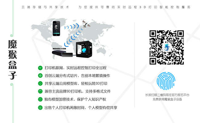 現(xiàn)在的人一提到3D打印感覺還是很神秘,你問他聽說過嗎,他說聽說過,可就是不會去接觸它,這是為什么呢?主要原因就是3D打印需要專業(yè)的人去建模、去切片,還得下載一堆軟件,打印起來既繁瑣又耗功夫,這個魔猴盒子還有兩個重要的功能,一個是全國首創(chuàng)云端切片,省了軟件下載安裝的麻煩;另一個是云服務體系中有海量的模型可以免費下載,你不會建模也沒關(guān)系,從里面挑一個就行,你還可以將你的模型有償共享出去或是存儲在里面,盒子有獨特的模型加密技術(shù),你也不用擔心知識產(chǎn)權(quán)被盜。