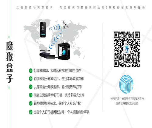 魔猴盒子是魔猴網(wǎng)新近研發(fā)出的3D打印智能控制單元。魔猴盒子的出現(xiàn)打破了距離的限制,實(shí)現(xiàn)異地打印,只要拿著魔猴盒子就能遙控處于另一方的打印機(jī)進(jìn)行打印,把時(shí)間從海綿里擠出來(lái);打印機(jī)上的攝像機(jī)能夠幫你實(shí)時(shí)掌握打印情況,在打印出現(xiàn)偏差時(shí)及時(shí)調(diào)整打印機(jī)設(shè)置; 魔猴盒子還能幫用戶出售空閑打印機(jī)的時(shí)間,變“閑”為錢;利用魔猴網(wǎng)獨(dú)有的3D打印模型加密技術(shù),有效保障知識(shí)產(chǎn)權(quán),防止模型信息泄露。