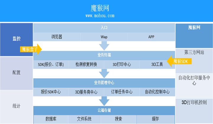 魔猴網(wǎng)作為中國3D打印行業(yè)中的佼佼者,一直在不斷地創(chuàng)新技術(shù),增強(qiáng)中國3D打印行業(yè)在世界上的競爭力。魔猴網(wǎng)明顯認(rèn)識到3D打印過程中所存在的問題,為了盡可能地解決這個(gè)問題,魔猴網(wǎng)依托先進(jìn)的云算法,研發(fā)出魔猴盒子與云服務(wù)體系,它們的存在能簡化3d打印流程,提升生產(chǎn)效率,量化服務(wù)標(biāo)準(zhǔn),拉近人和物之間的距離。魔猴網(wǎng)子模塊功能已經(jīng)全部實(shí)現(xiàn),現(xiàn)在正在打通各個(gè)環(huán)節(jié)進(jìn)的云算法。