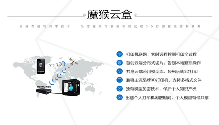 魔猴云盒是中國首個3D打印智能控制單元,是3D打印生產(chǎn)設(shè)備的互聯(lián)網(wǎng)入口。用戶通過魔猴云盒可以將3D打印設(shè)備連入魔猴云,并能夠使用APP、Wap、瀏覽器對打印機進行統(tǒng)一調(diào)配管理,實現(xiàn)模型預覽與編輯、打印機調(diào)試與多打印機管理。針對學校與工廠等使用場景,魔猴云盒能夠?qū)崿F(xiàn)打印機隊列管理與賬號權(quán)限管理等功能。 通過設(shè)備聯(lián)網(wǎng)控制,魔猴云盒能夠簡化3D打印流程,降低3D打印門檻,提高生產(chǎn)轉(zhuǎn)化率。