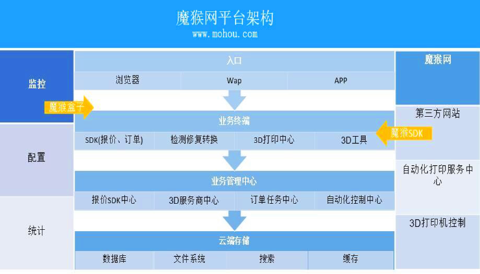 支撐魔猴網(wǎng)3D打印智能制造中心的魔猴云體系,能夠為3D打印服務(wù)需求方、打印機使用者、3D打印服務(wù)商提供專業(yè)技術(shù)支持?;谠朴嬎泱w系,魔猴云以大數(shù)據(jù)為切入點,共享打印經(jīng)驗,提升3D打印生產(chǎn)效率,進一步降低打印門檻。