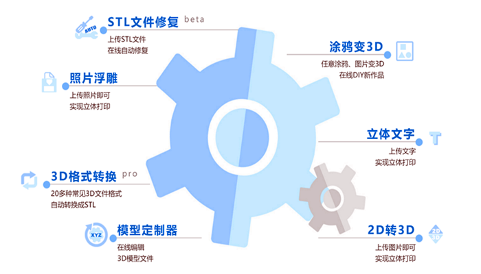 魔猴云集成多種3D打印操作過程中的必要功能,能夠?qū)崿F(xiàn)2D轉(zhuǎn)3D、照片浮雕、模型修復、文件格式轉(zhuǎn)換等工具功能。同時能夠?qū)崿F(xiàn)云端切片,模型存儲與打印設(shè)定推薦等云端功能,徹底告別繁瑣的本地操作,實現(xiàn)一鍵打印。