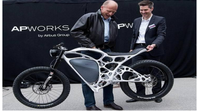 “空中巴士”公司執(zhí)行總裁湯姆-恩德斯(圖左)和該公司子公司“APWorks”負(fù)責(zé)人喬西姆-賽特勒(圖右),在德國亮相首款3D打印電動(dòng)摩托車,它是由金屬粉末材料通過激光融合技術(shù)制造的,重量僅有35公斤,時(shí)速可達(dá)60公里。
