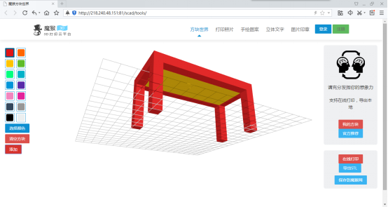 魔猴方塊世界的界面從左到右分為三大板塊,左側(cè)是不同的顏色選擇列表和制作按鈕,從顏色上首先我們就能感受到這款應用給用戶的選擇還是很豐富的,一掃沉悶多了些活力。頁面中間區(qū)域是一塊網(wǎng)格狀的畫板,用戶在這里可以通過搭建積木隨意創(chuàng)造自己的模型。最右側(cè)則是一些保存、導出文件和打印的功能按鈕。