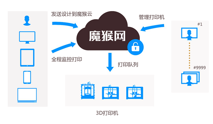 魔猴網(wǎng)是目前國內(nèi)唯一一家擁有云計算能力的3D打印服務(wù)提供商,魔猴云是一種基于云計算的3D打印機智能調(diào)度系統(tǒng),魔猴盒子能夠?qū)崿F(xiàn)3D打印云端化,向用戶提供免費超大云空間,實現(xiàn)工業(yè)生產(chǎn)單元互連與自動化,整合分散資源,提升生產(chǎn)效率。不難看出,魔猴盒子是對目前3D打印生產(chǎn)模式的革新,是工業(yè)4.0時代實現(xiàn)3D打印分布式制造的便捷神器。