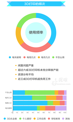 整體來看,3D打印機(jī)在不同行業(yè)人群中分布很不均勻,存在大量閑置或部分超負(fù)荷工作現(xiàn)象。