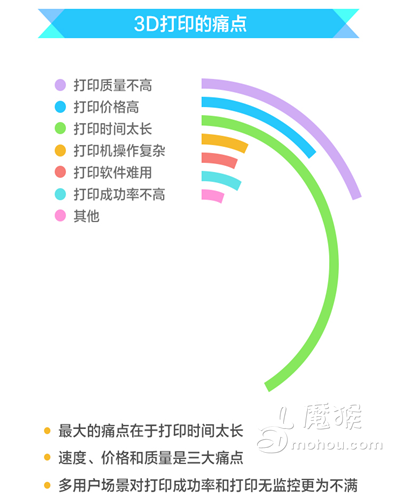 3D打印最大的痛點(diǎn)是打印時間太長,用戶必須時刻守在機(jī)器旁邊,否則極易導(dǎo)致打印失敗,這太耗費(fèi)用戶寶貴的時間,所以很多用戶對3D打印無法遠(yuǎn)程實(shí)時監(jiān)控很不滿意。此外,由報(bào)告來看,速度、價(jià)格和質(zhì)量也是影響3D打印普及的重要桎梏。