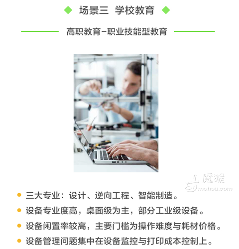 高校教育使用3D打印機(jī)的專業(yè)主要有:設(shè)計(jì)、逆向工程、智能制造等專業(yè),他們擁有的設(shè)備專業(yè)度較高,大多以桌面級為主,部分擁有工業(yè)級設(shè)備。這塊主要的問題也是3D打印閑置率較高,受限于3D打印操作困難,耗材價(jià)格較高,3D打印機(jī)使用頻率較低。