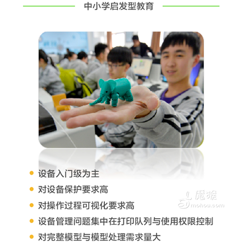中小學(xué)啟發(fā)教育用的設(shè)備大多是入門級,對設(shè)備保護(hù)要求較高,并對完整模型與模型處理需求量大。他們設(shè)備管理問題主要集中在打印列隊(duì)與使用權(quán)限控制。