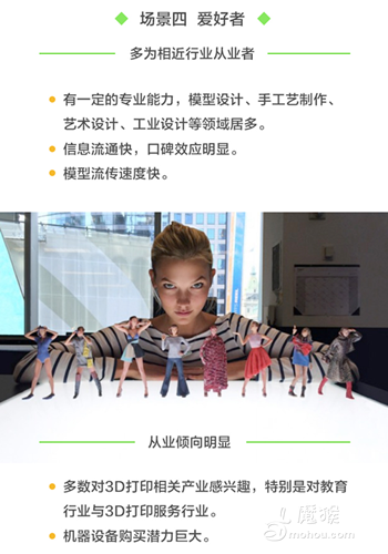 3D打印愛好者大部分有一定的專業(yè)能力,從事模型設(shè)計(jì)、手工藝制作、藝術(shù)設(shè)計(jì)、工業(yè)設(shè)計(jì)等行業(yè)居多。愛好者間的信息流通很快,尤其是模型流傳速度較快,口碑效應(yīng)明顯,他們還是機(jī)器設(shè)備購買的巨大潛力股。