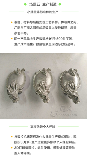 生產(chǎn)制造方面主要問題有:設(shè)備、材料與后期處理工藝多樣,件與件之間、廠商和廠商之間在成品效果上差異明顯,質(zhì)量層次不齊;同一產(chǎn)品單次生產(chǎn)數(shù)量從1件到500件不等,生產(chǎn)成本隨生產(chǎn)數(shù)量增多呈現(xiàn)邊際效應(yīng)遞減;與數(shù)控機(jī)床等標(biāo)準(zhǔn)化大批量生產(chǎn)模式相比,現(xiàn)階段3D打印生產(chǎn)過程更多依賴個人經(jīng)驗(yàn)判斷;3D打印機(jī)操控、軟件使用、模型處理等經(jīng)驗(yàn)型人才稀缺。