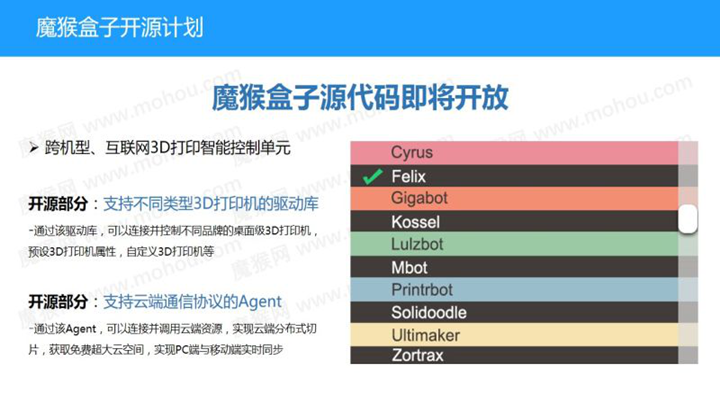 如果說剛剛完成新三板掛牌的聯(lián)泰攜手魔猴網(wǎng)達(dá)成戰(zhàn)略合作協(xié)議為推動3D打印工業(yè)4.0提供了新動力,那么,魔猴盒子的開源化則是實(shí)打?qū)嵉臑?D打印的普及推廣加快速度。國外的同行像OctoPrint、3DPrinter公司也向公眾開放過一部分代碼,但都是針對本地3D打印機(jī)的控制,而魔猴盒子開源不僅在兼容打印機(jī)、支持3D打印文件上可以做出更改,更是向大眾開放了魔猴網(wǎng)的云端系統(tǒng)。