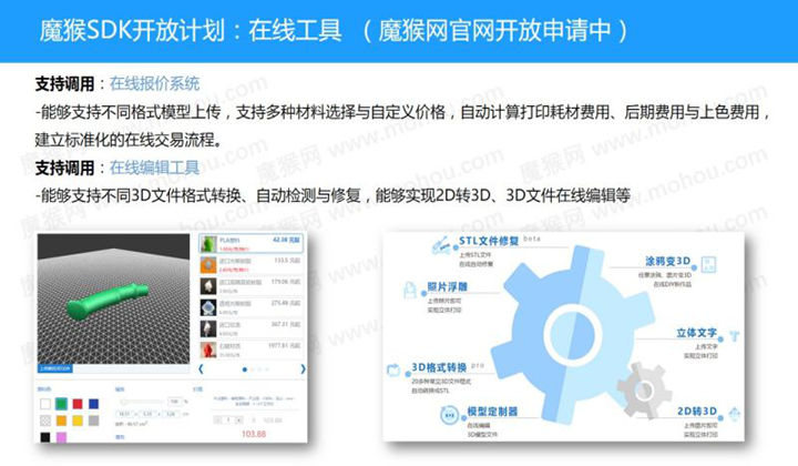 此外,張勇博士還介紹了魔猴網(wǎng)的另一項(xiàng)重量級產(chǎn)品——魔猴SDK,它支持調(diào)用魔猴網(wǎng)的即時在線報價系統(tǒng)和在線編輯工具,可以幫助用戶建立標(biāo)準(zhǔn)化的在線交易流程,輕松實(shí)現(xiàn)3D文件格式的轉(zhuǎn)換、自動檢測與修復(fù)等3D文件的在線編輯。