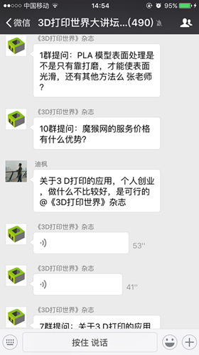 值得注意的是,本期《3D打印世界》大講壇匯聚了多達(dá)7000名3D打印從業(yè)者和愛好者進(jìn)駐到14個大講壇直播群觀看演講。7000人,以每100人的大學(xué)課堂計算,相當(dāng)于張勇博士在同時面向70個課堂做演講,這讓小編在感慨當(dāng)下網(wǎng)絡(luò)直播火爆的同時,也不得不對魔猴網(wǎng)在業(yè)內(nèi)的品牌關(guān)注度刮目相看。