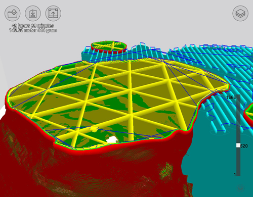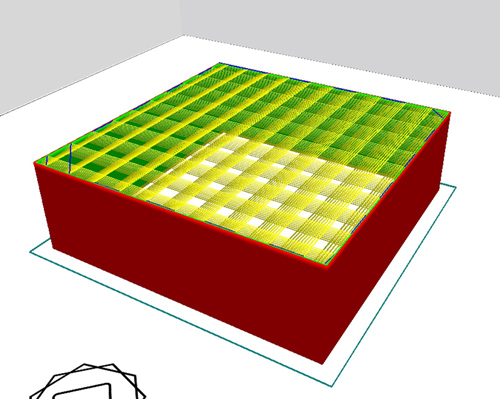這是“3D”填充的視圖。很遺憾,CURA軟件沒有顯示整個軟件結構,僅僅是一些層。想象一下,這些交叉結構會在增加層的時候滑動,形成對角對準的立方體內(nèi)部結構。這個結構確實不是標準的垂直結構,它能從多個角度施加壓力,帶來更大的強度。