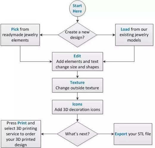 在我國,未來是否會誕生像手機APP這樣的首飾模型軟件或者像WIZEgem為首飾電商和品牌商所提供的建模插件?從而首飾專賣店和百貨商場將通過軟件與消費者和3D打印服務溝通,輕松為用戶提供個性化首飾制作服務。小編認為這方面的可能性很大,魔猴網(wǎng)作為國內(nèi)3D打印云服務平臺的佼佼者,其現(xiàn)有的云打印服務流程是網(wǎng)上以及微信下單,這與互聯(lián)網(wǎng)+個性化定制3D打印首飾的模式很相像,只不過還差一個類似于插件這樣可以傳播的產(chǎn)品。