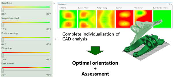 ASAP原則的第一步對打印部件進(jìn)行基于CAD的評估,并計(jì)算預(yù)計(jì)出預(yù)計(jì)變形傾向、加工要求、支撐量和所選部件在所有可能方向下的生成時(shí)間等。該軟件的這一階段能夠使制造商在進(jìn)一步開發(fā)一個(gè)部件之前評估其設(shè)計(jì)和成本可行性,同時(shí)也可以根據(jù)用戶偏好和計(jì)算的處理效果手動(dòng)或自動(dòng)調(diào)整零部件的打印方向。