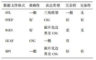 RPI 文件格式是由 Rensselacer Desaearch Centre 與 Rensselar Polytechnic Institute 聯(lián)合開發(fā)設(shè)計,可 從 STL 格式數(shù)據(jù)中獲取. 該文件由實體集構(gòu)成,定 義了邊、面片等實體類型,并將其拓?fù)湫畔⒁胝Z法定義以及對應(yīng)的數(shù)據(jù)構(gòu)成了實體部分. 其中,語 法定義部分包括記錄號、實體名以及實體的結(jié)束標(biāo) 志. 由字段組成的記錄存放著所有的數(shù)據(jù),每一個 記錄都與語法部分相對應(yīng). 因此,RPI 文件的優(yōu)點 是冗余性好、結(jié)構(gòu)緊湊,并且提供了基本 CSG 描述, 但其缺點是后續(xù)處理比較復(fù)雜,且不能識別近似實 體的曲面. 表 1 為幾種三維數(shù)據(jù)文件格式的比較.