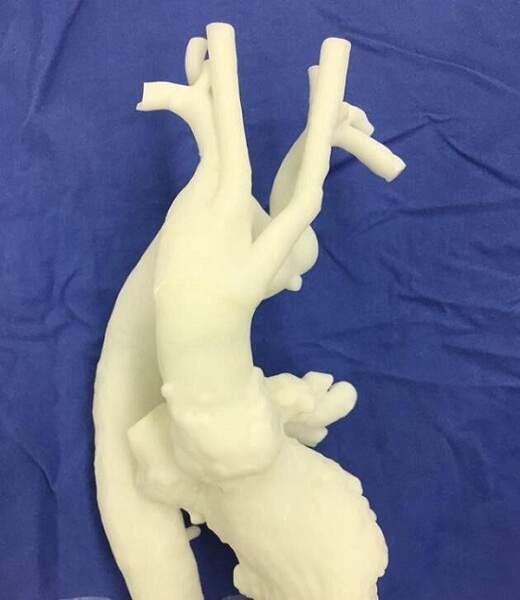 3D打印的人體組織模型正在越來越多地被用于外科手術。據(jù)了解,近日,復旦大學附屬中山醫(yī)院心外科應用3D打印技術輔助外科手術,成功治愈罹患罕見先天性復雜變異胸主動脈瘤的患者?;颊呶橄壬荒昵伴_始反復出現(xiàn)活動后的胸悶胸痛。在中山醫(yī)院行胸部CT檢查時發(fā)現(xiàn)胸主動脈畸形,確診為罕見的胸主動脈Kommerell憩室(科梅內爾憩室)。如何能簡化治療將復雜問題簡單處理、既治愈疾病又保證患者絕對安全是擺在醫(yī)生面前的難題,最終專家采取使用3D打印技術輔助手術,按1:1的比例3D打印變異的主動脈及附屬血管模型。