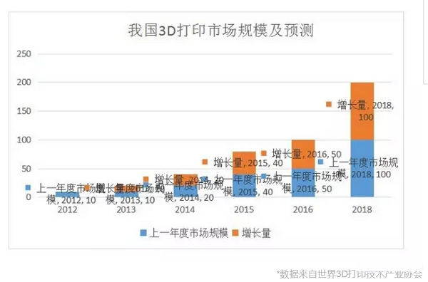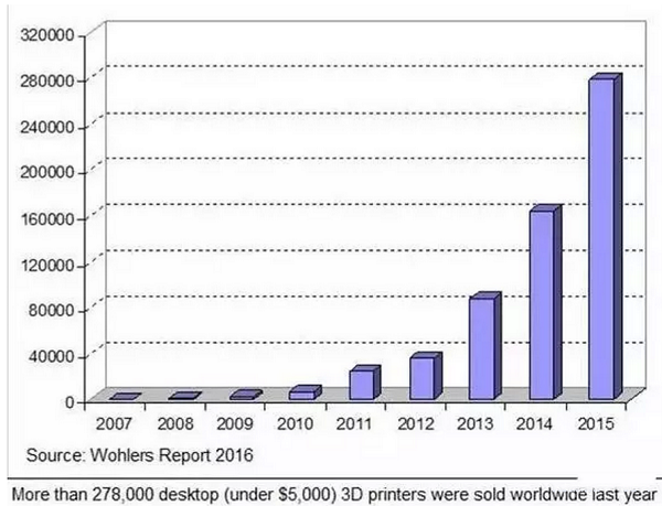 自2011年以來,我國(guó)3D產(chǎn)業(yè)進(jìn)入了高速發(fā)展期,2014年~2018年我國(guó)3D打印產(chǎn)業(yè)的市場(chǎng)規(guī)模年均復(fù)合增長(zhǎng)率將高達(dá)43.4%,到2018年市場(chǎng)規(guī)模有望突破200億元,屆時(shí)我國(guó)或?qū)⑷〈绹?guó)成為全球最大的3D打印市場(chǎng)。增材制造領(lǐng)域知名的市場(chǎng)咨詢公司W(wǎng)ohlers Associates發(fā)布了《沃勒斯報(bào)告2016》。該報(bào)告指出,2015年,全球增材制造和3D打印市場(chǎng)銷售額達(dá)到51.65億美元,與2014年相比增長(zhǎng)了10億美元,增長(zhǎng)率達(dá)到25.9%。