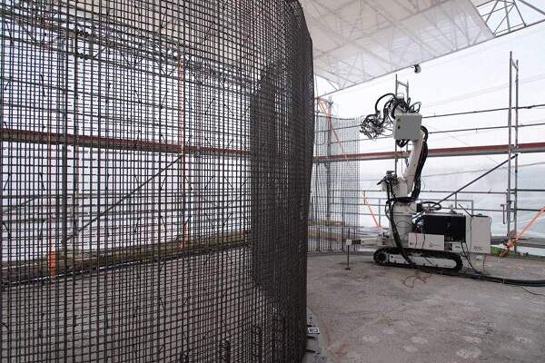 項目總共用到了兩種3D打印機。其一是ETH Zurich的Mesh Mould—它配有一條機械臂,能靈活打印出復(fù)雜金屬框架,作為之后混凝土澆筑的鋼筋;其二是某沙子打印機 — 它目前正被用于打造天花板的智能平板結(jié)構(gòu)。