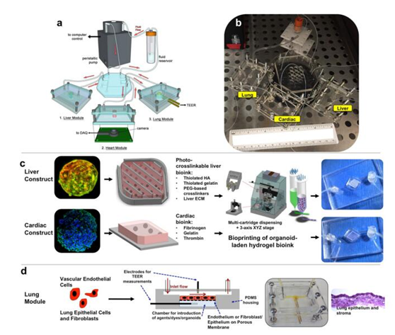 由于芯片中心臟、肝臟和肺組織具有不用的制造要求,研究團隊使用生物3D打印機和不同成分的“生物墨水”分別制造三種組織。例如,芯片中的肝臟類器官的生物墨水是由原代人體肝臟細胞、星狀細胞和庫普弗細胞等材料構(gòu)成的,而心臟組織的生物墨水是由誘導多功能干細胞等材料構(gòu)成的。打印完成后,研究團隊使用ECM衍生的生物墨水或朊蛋白和明膠生物蛋白將這些組織轉(zhuǎn)移到芯片的微反應器中。肺組織是在具有類似因子的微反應器中制造的,其中具有固定的半多孔膜、肺成纖維細胞、上皮細胞和內(nèi)皮細胞。在完成三種組織的生物3D打印之后,研究團隊將裝置密封并連接到循環(huán)灌注系統(tǒng)。芯片中的流體由微蠕動泵進行驅(qū)動。