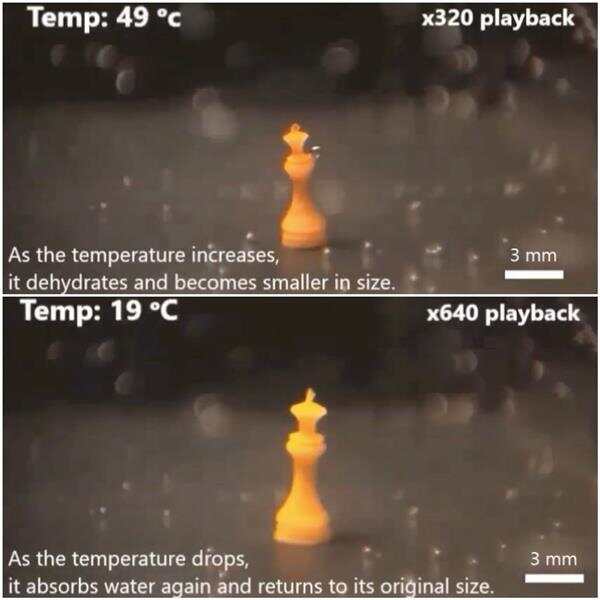 研究人員還開發(fā)了一種方法來控制3D打印的水凝膠物體在暴露于特定條件下會(huì)如何收縮或生長。例如,如果3D打印結(jié)構(gòu)放置在溫度低于32°C(90°F)的環(huán)境中,則會(huì)吸收環(huán)境中的水分并且尺寸增大。然而,當(dāng)溫度升高到32℃以上時(shí),水凝膠逐漸收縮而失水。