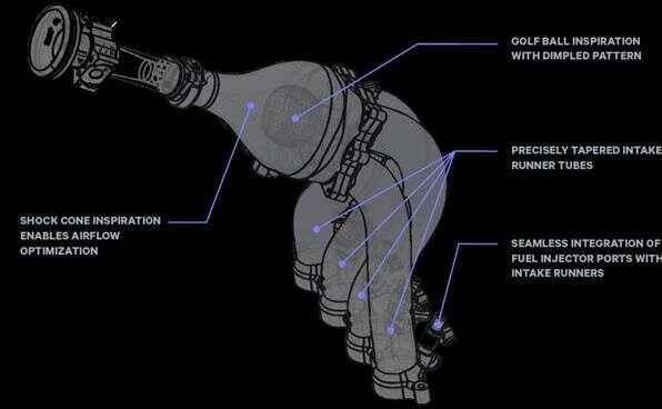 CSU大學(xué)生賽車(chē)隊(duì)使用Carbon專(zhuān)有的RPU70材料3D打印,而賽車(chē)進(jìn)氣歧管改造為7英寸長(zhǎng)的球形結(jié)構(gòu),取代了之前的增壓裝置。設(shè)計(jì)靈感來(lái)源于超音速?lài)姎獍l(fā)動(dòng)機(jī)錐體,根據(jù)形狀來(lái)調(diào)節(jié)進(jìn)氣量。簡(jiǎn)單來(lái)說(shuō)就是在節(jié)氣門(mén)縮小、減少的情況下提升增壓壓強(qiáng),從而提升單位進(jìn)氣量。