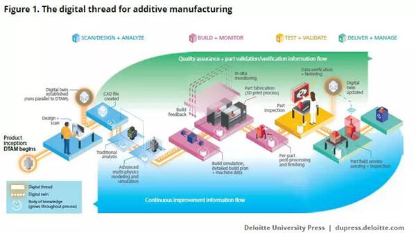 德勤在<3D opportunity for blockchain>中提到增材制造數(shù)字線程DTAM(digital thread for additive manufacturing)的概念,并指出數(shù)字線程沒有被大量引入到增材制造中,所以限制了增材制造進入產(chǎn)業(yè)化生產(chǎn)階段。