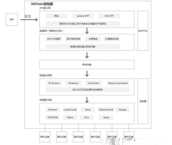 技術(shù)架構(gòu)可以分為兩大塊:軟件平臺和控制器。軟件平臺主要為一個可供開發(fā)者使用的接口平臺,開發(fā)者通過調(diào)用 API 接口即可實現(xiàn)自己的應(yīng)用網(wǎng)站或者 APP 功能的實現(xiàn)??刂破髯鰹橐粋€硬件控制系統(tǒng),包括硬件部分和軟件部分,主要作用是通過控制器來與上層軟件平臺的數(shù)據(jù)交互,并控制相應(yīng)的 3D 打印設(shè)備執(zhí)行操作。
