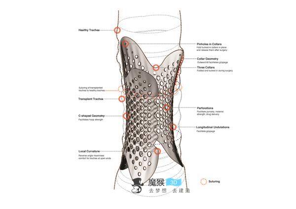 氣管支架通常用于支持氣管移植,并在喉癌,創(chuàng)傷和老年的情況下治療塌陷的氣道。支架通常被制造為非定制的管狀網(wǎng)。 Tonkin Liu的支架設(shè)計(jì)是C形而不是管狀,目的是更好地適應(yīng)每個(gè)患者喉嚨的個(gè)體形狀。 C形設(shè)計(jì)一旦插入就會(huì)展開(kāi),從馬蹄蓮花瓣的幾何原理中汲取靈感。該裝置由醫(yī)用級(jí)硅制成,具有穿孔表面,允許透氣性和藥物遞送至氣管組織。