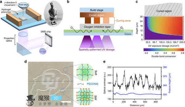 通過氧氣抑制輔助立體光刻法對基質(zhì)剛度和幾何形狀進(jìn)行正交編程。數(shù)字投影立體光刻3D打印系統(tǒng)的示意圖設(shè)置,其中水凝膠前體溶液通過UV暴露逐層固化。插圖是3D打印的復(fù)雜對象的SEM圖像。比例尺為500μm。 b氧抑制輔助印刷的示意圖,其中固化區(qū)物理地限制在固化區(qū)域和氧氣抑制層之間。 c不同紫外線照射劑量下雙鍵轉(zhuǎn)化率的深度分布。氧氣抑制層的厚度與曝光劑量的關(guān)系很弱,固化厚度也是如此。當(dāng)劑量高于閾值時(shí),雙鍵轉(zhuǎn)化率隨劑量迅速增加。 d印刷水?;諛?biāo)的明場光學(xué)圖像,具有獨(dú)立圖案的剛度和幾何形狀(二元剛度但平坦的表面)。高光學(xué)對比度表明交聯(lián)密度的強(qiáng)烈差異,因此表明剛度。比例尺為200μm。 e沿b中虛線的光學(xué)對比度(黑線)和幾何(藍(lán)線)變化的量化顯示對比度(剛度)的明顯差異,但特征高度變化很?。?lt;1%)