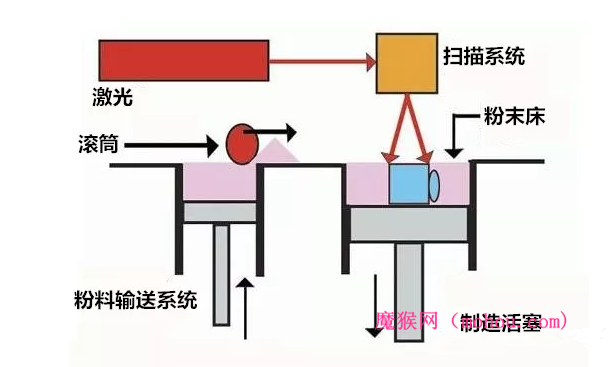 3DP具有能夠大規(guī)模成型出陶瓷部件,成本較低的優(yōu)勢,但也具有黏結(jié)劑黏合強(qiáng)度受限導(dǎo)致部件強(qiáng)度有限,難以得到機(jī)械性能優(yōu)良的陶瓷器件的劣勢。 5激光選區(qū)燒結(jié)/熔融(SLS/SLM) SLM 的思想最初由德國Fraunhofer研究所于1995年提出,SLS和SLM原理與三維印刷技術(shù)較類似,將粘接劑換為激光束。在高功率比重激光器激光束開始掃描前,水平鋪粉輥先把金屬粉末平鋪到加工室的基板上,然后激光束將按當(dāng)前層的輪廓信息選擇性地熔化基板上的粉末,加工出當(dāng)前層的輪廓,然后調(diào)入下一圖層進(jìn)行加工,如此層層加工,直到整個(gè)部件加工完畢。