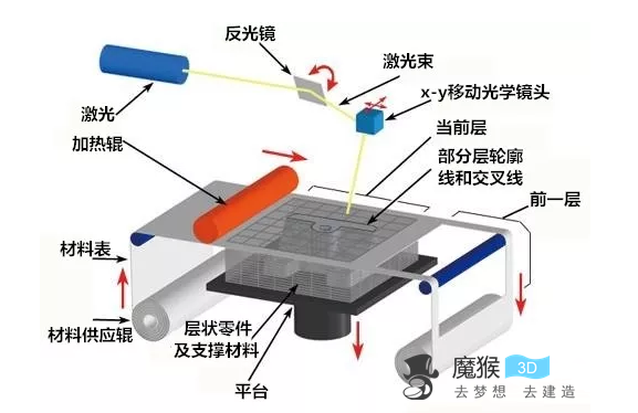 SLA具有成型精度極高陶瓷件燒結(jié)后致比重高的優(yōu)勢;但存在后續(xù)工藝麻煩,以及二次固化問題,另外,SLA難以加工折射率較高的陶瓷材料。 7疊層實(shí)體制造(LOM) 在層片疊加制造工藝中,將單面涂有熱溶膠的箔材通過熱輥加熱,由紙、陶瓷箔、金屬箔等構(gòu)成的材料就會粘接在一起。然后上方的激光器按照CAD模型分層數(shù)據(jù),用激光束將箔材切割成所制部件的內(nèi)外輪廓,再鋪上新的一層箔材,重復(fù)上述過程,直至整個(gè)零部件打印完成。