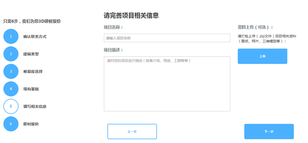 第五步:完善項(xiàng)目信息,將您的項(xiàng)目具體的要求填寫,有設(shè)計(jì)圖紙或是其它素材可打包上傳,以便建模師更好的完成建模。