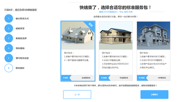 第六步:最后一步,系統(tǒng)會(huì)根據(jù)您的信息推薦合適您的服務(wù)包,您根據(jù)推薦或者自己選擇想要的服務(wù)包,提交即可,隨后魔猴網(wǎng)會(huì)跟您聯(lián)系確認(rèn)訂單信息,如果信息無(wú)誤,將按照完整報(bào)價(jià)為您建模服務(wù)。。