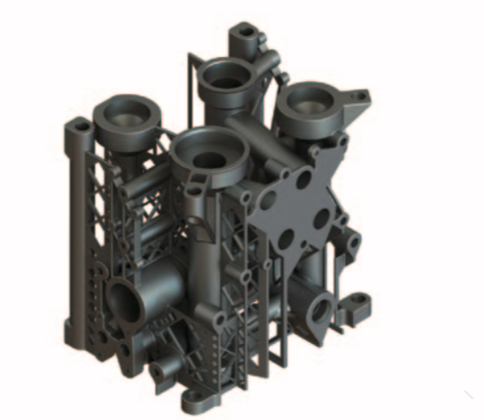 由于3D打印 (AM) 技術(shù)能夠構(gòu)建內(nèi)部特征和 通道,因此非常適合用于設(shè)計(jì)和制造歧管。雷尼紹與客戶攜手合作,以3D打印技術(shù)為導(dǎo)向,重新對(duì)客戶當(dāng)前的液壓歧管進(jìn)行了設(shè)計(jì)。該項(xiàng)目的主要目標(biāo)是在不影響組件結(jié)實(shí)性的前提下,盡量減輕其重量。由于3D打印技術(shù)具有很高的設(shè)計(jì)自由度,因此設(shè)計(jì)人員可以依托這一優(yōu)勢(shì)來提高流動(dòng)通道的效率。