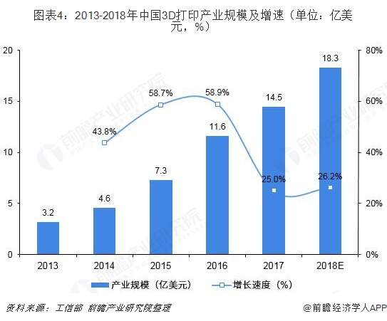 我國3D打印從1988年發(fā)展至今,呈現(xiàn)出不斷深化、不斷擴大應用的態(tài)勢。2015-2017年的3年間,中國3D打印產(chǎn)業(yè)規(guī)模實現(xiàn)了翻倍增長,年均增速超過25%。2017年,中國3D打印領域相關企業(yè)超過500家,產(chǎn)業(yè)規(guī)模已達100億元,增速略微放緩至25%左右,但仍高于全球4個百分點。2018年上半年,中國3D打印產(chǎn)業(yè)維持25%以上增速,2018年整體規(guī)模有望達到18.3億美元。
