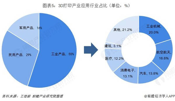 3D打印應用領域廣泛,其在下游應用行業(yè)和具體用途領域的分布反映了這一技術具有的優(yōu)勢和特點,同時也反映了這一技術的局限和在發(fā)展過程中尚需完善的地方。3D打印機需求量較大的行業(yè)包括政府、航天和國防、醫(yī)療設備、高科技、教育業(yè)以及制造業(yè)。目前,應用領域排名前三的是工業(yè)機械、航空航天和汽車,分別占市場份額的20.0%、16.6%和13.8%。