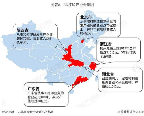 其中,北京、浙江、陜西、湖北、廣東等省份產(chǎn)業(yè)發(fā)展較快。目前,北京市從事3D打印技術研發(fā)、生產(chǎn)與服務的企業(yè)達70家以上,2017年實現(xiàn)銷售收入約6億元。廣東省從事3D業(yè)務的企業(yè)超過400家,實現(xiàn)產(chǎn)值超過30億元。陜西省從事3D研發(fā)生產(chǎn)企業(yè)超過70家,2017年營業(yè)收入達5億多元。