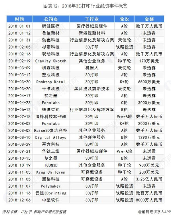 近年來,隨著市場監(jiān)管趨嚴、行業(yè)去偽存真加速,以及一系列風險事件的發(fā)生,3D打印熱度逐步降低,資本市場對增材制造企業(yè)估值趨于理性。2016年中國3D打印行業(yè)發(fā)生融資事件14起,2017年增至24起,凈增加10起。2018年市場趨向冷靜,全年融資事件26起,金額普遍偏小,多集中于3D打印設備制造領域。