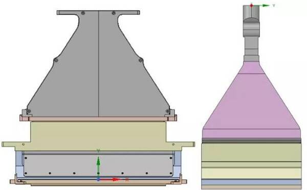 1左圖為某設(shè)計型號撒粉器的外部大致結(jié)構(gòu),模擬過程中對撒粉器模型進(jìn)行了簡化,主要去除了模擬分析過程中不必要的部位,保留了粉末流過的所有腔室結(jié)構(gòu),并加上了給粉器的相關(guān)結(jié)構(gòu),模型的簡化在Ansys SpaceClaim中進(jìn)行,簡化后的模型如圖1右圖所示。