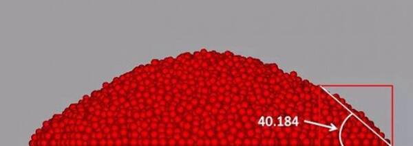 在離散元分析中粉末安息角跟粉末顆粒間的靜摩擦系數(shù)、顆粒間滾動摩擦系數(shù)、滾動阻力系數(shù)、底部平板與粉末摩擦系數(shù)和黏附系數(shù)等參數(shù)的設(shè)定有關(guān),為了跟實(shí)驗(yàn)測得的粉末安息角接近(實(shí)驗(yàn)測得某種金屬粉末安息角:40°~45°),通過改變這些參數(shù)進(jìn)行安息角模擬測試(圖2),最終通過離散元模擬確定了這些參數(shù)的值,圖3為最終模擬得到的合適的安息角(40.184°)。
