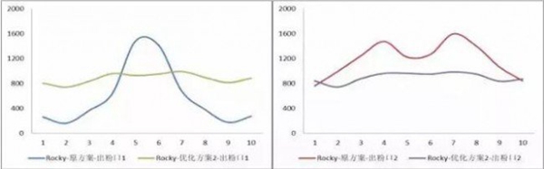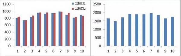 5(左)兩個出粉口落粉分布情況 ;圖6(右) 出粉口累加落粉分布情況