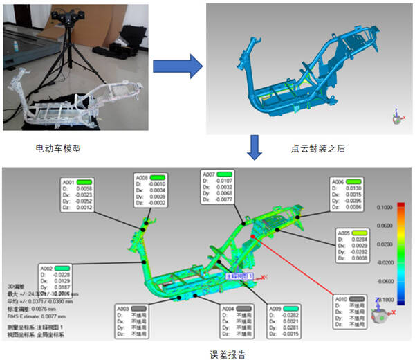 現(xiàn)以電動(dòng)車的檢測(cè)來對(duì)檢測(cè)的過程進(jìn)行簡(jiǎn)單的說明:首先我們對(duì)電動(dòng)車需要檢測(cè)的位置進(jìn)行掃描,從而獲得電動(dòng)車的點(diǎn)云數(shù)據(jù),然后進(jìn)行封裝,建模,而后通過和原始圖紙的對(duì)比生成誤差圖譜和誤差報(bào)告。如下圖所示: