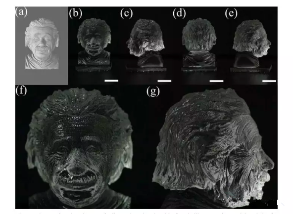 他們首先將激光脈沖“松散聚焦”到硅石中,在XY兩個方向的兩個不同網(wǎng)格中蝕刻多條線。在下面的圖片中,可以更好地了解他們工作的原理,因為作者創(chuàng)造了愛因斯坦的頭部,所有的“細(xì)微特征”都可見,甚至是眼瞼。